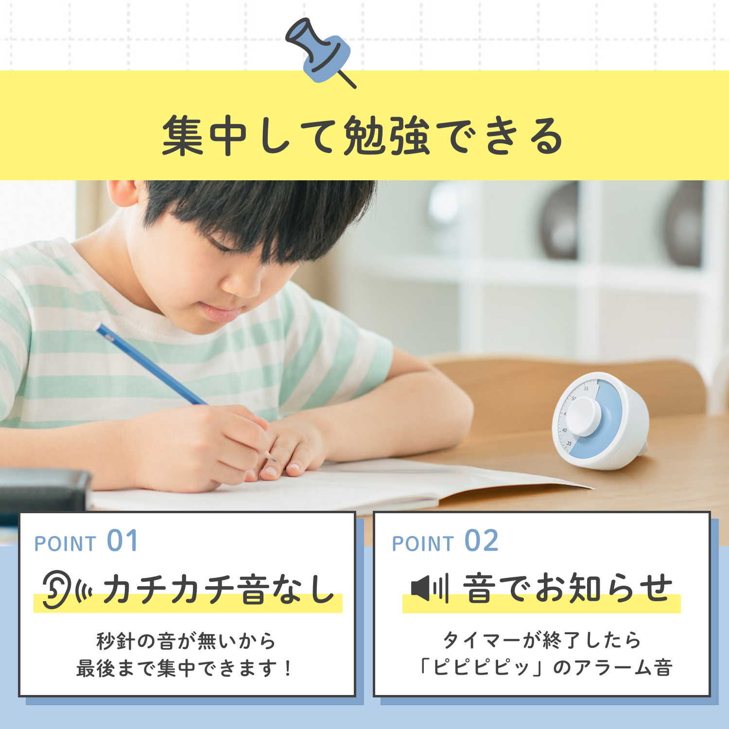 2. 秒針の音が無く、最後まで集中できます