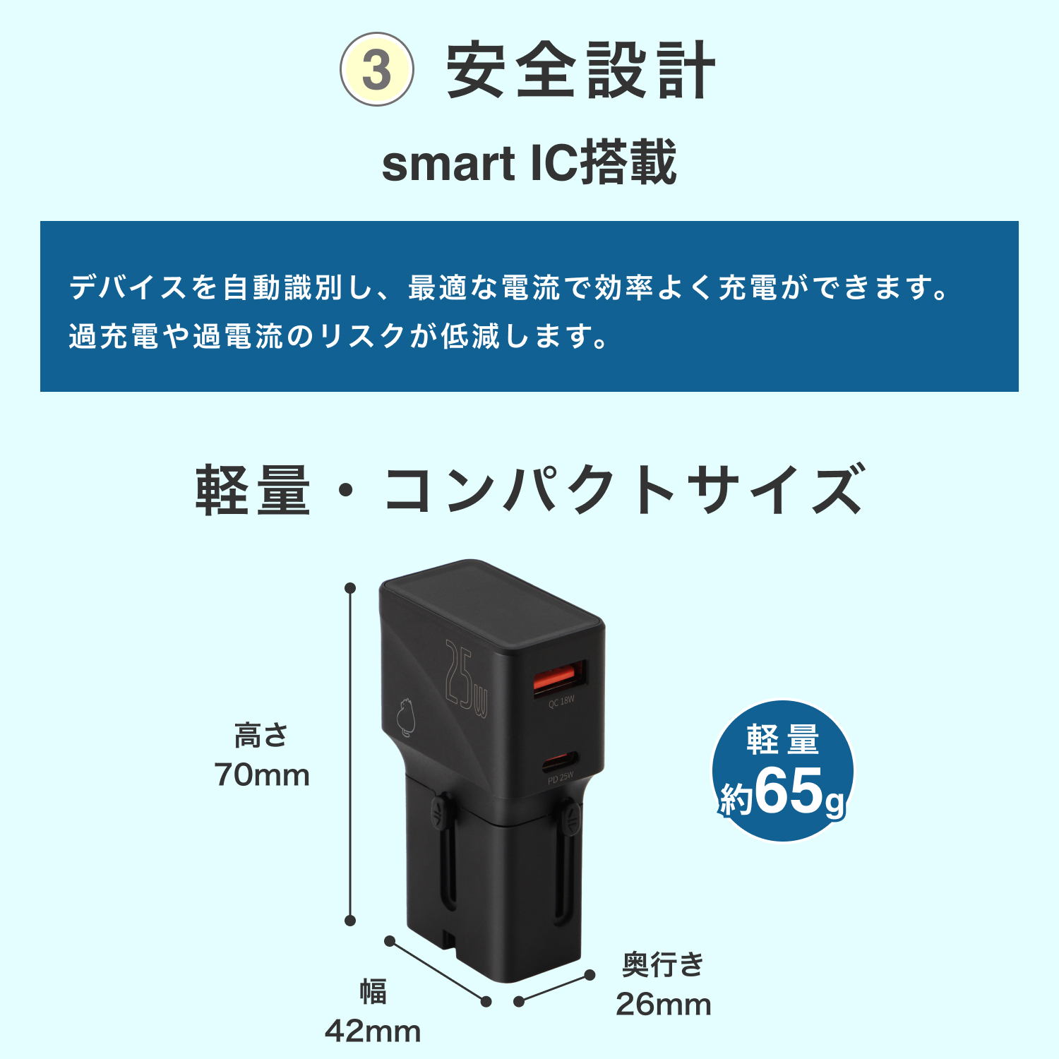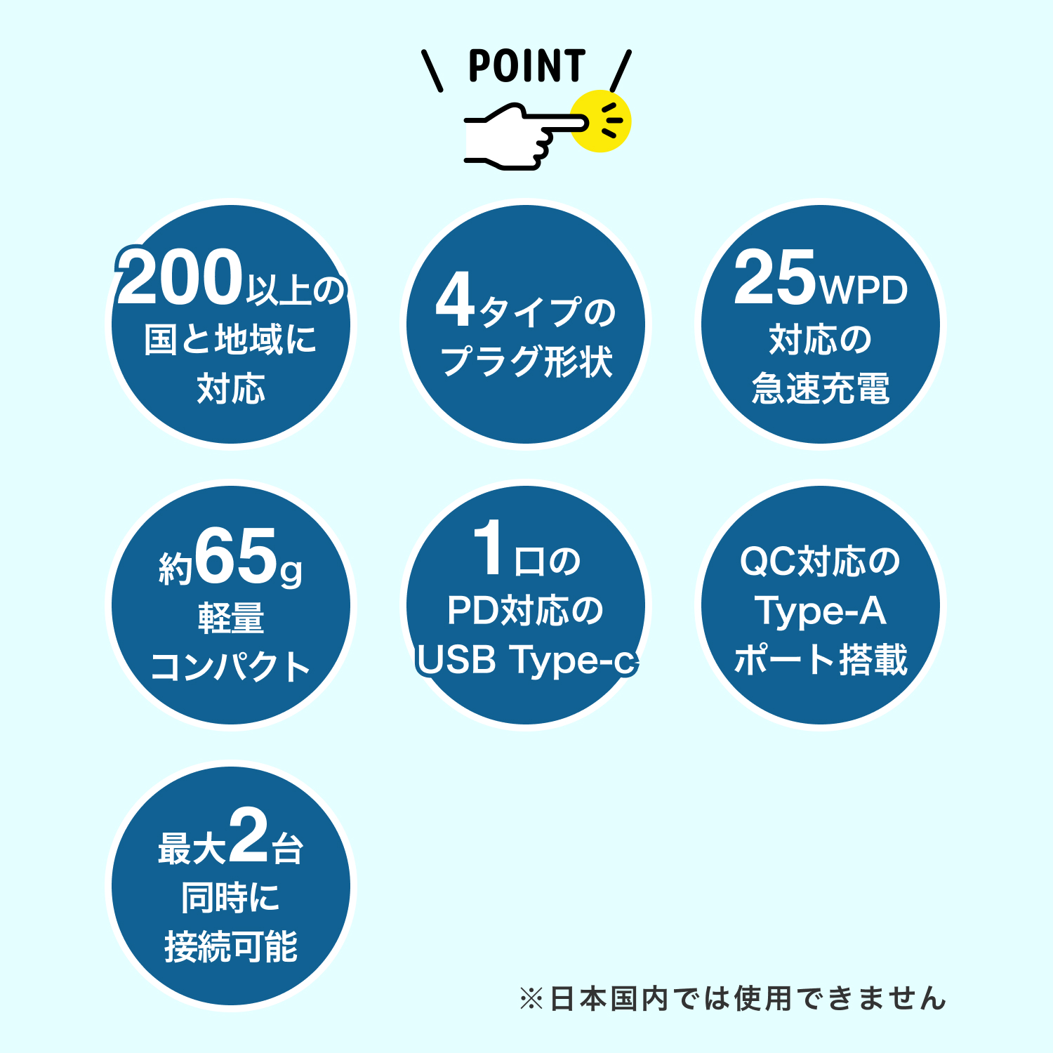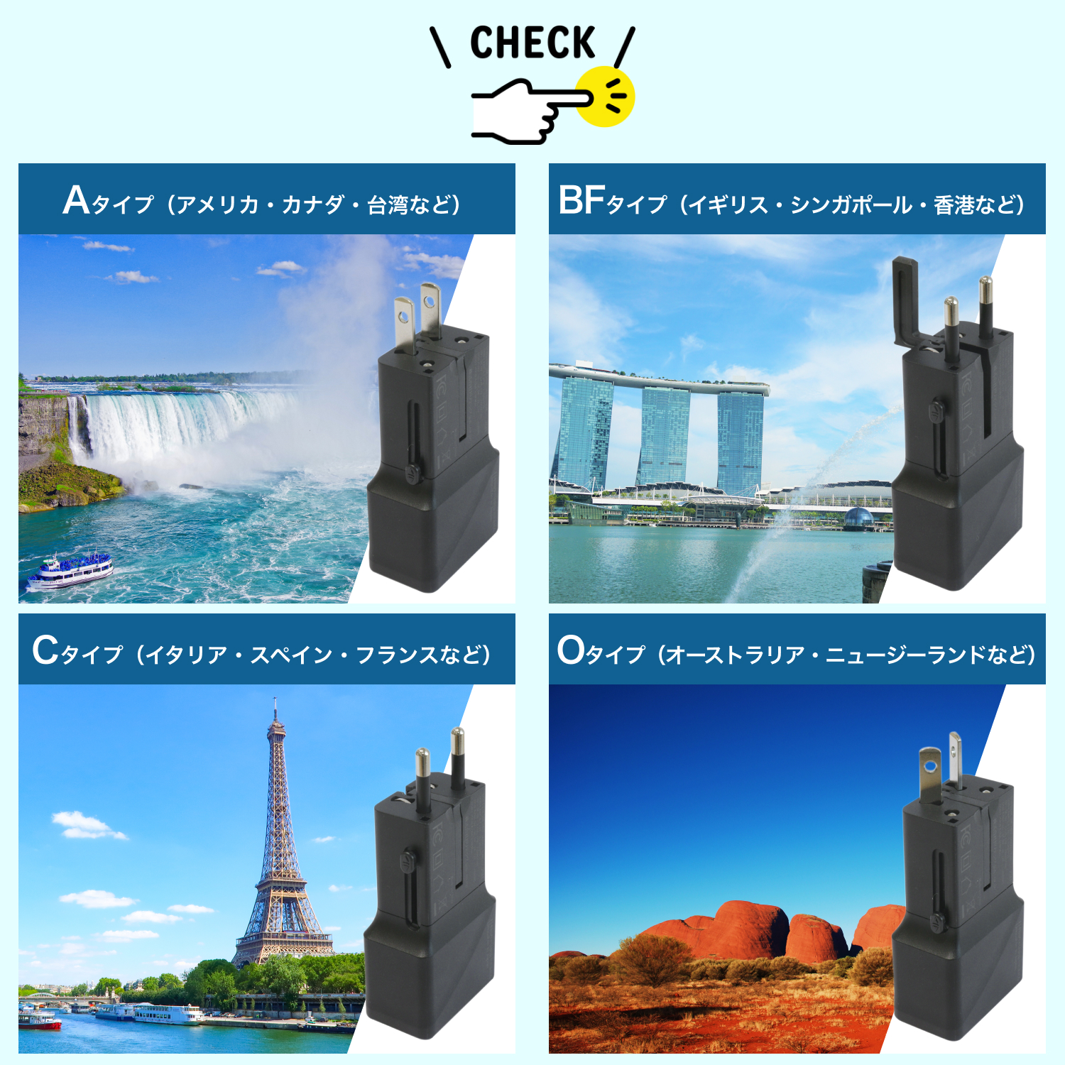 海外への出張や旅行に便利な旅行グッズで、Aタイプ、Oタイプ、BFタイプ、Cタイプに対応しています。