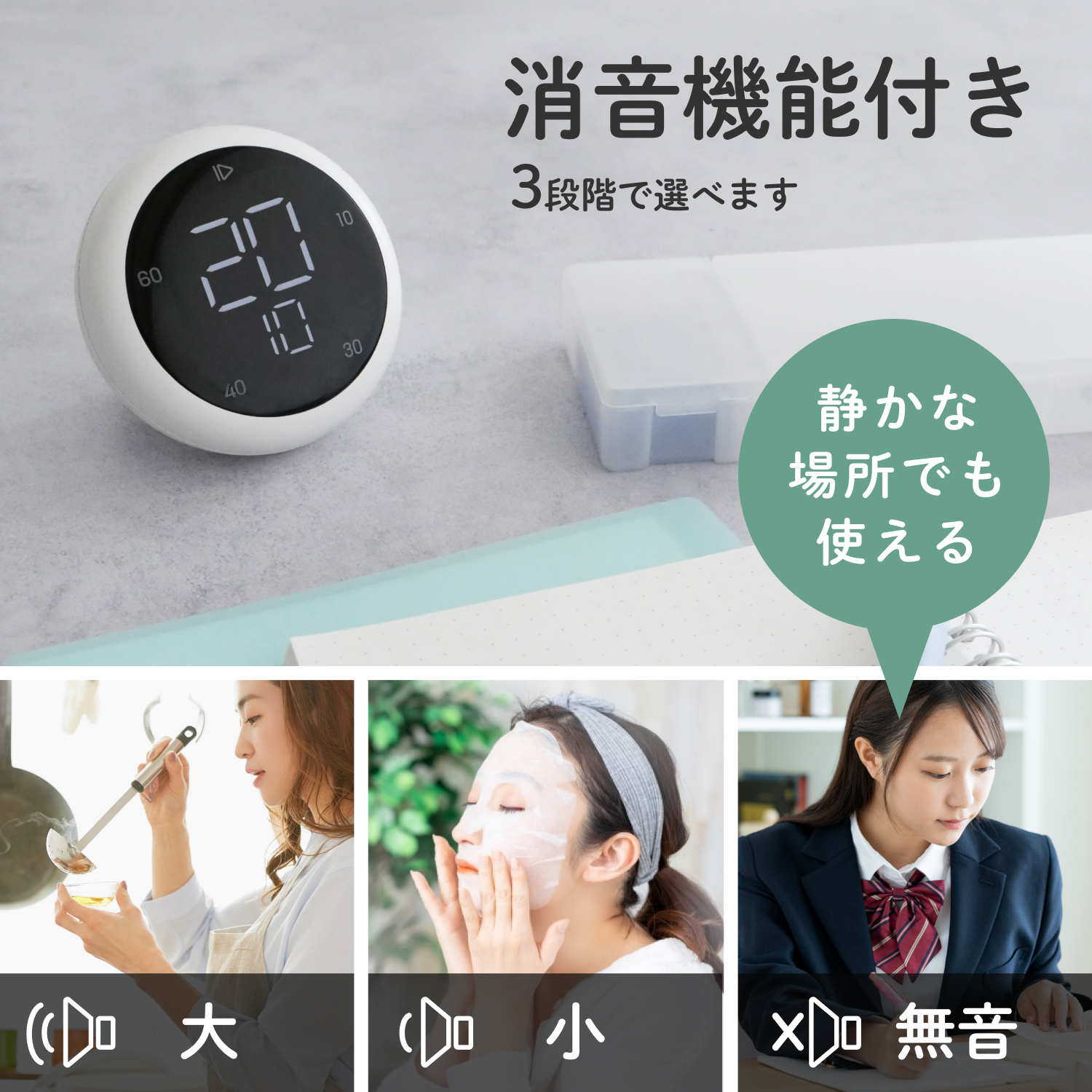 2. 音量は大・小・無音から選べて静かな場所でも使える