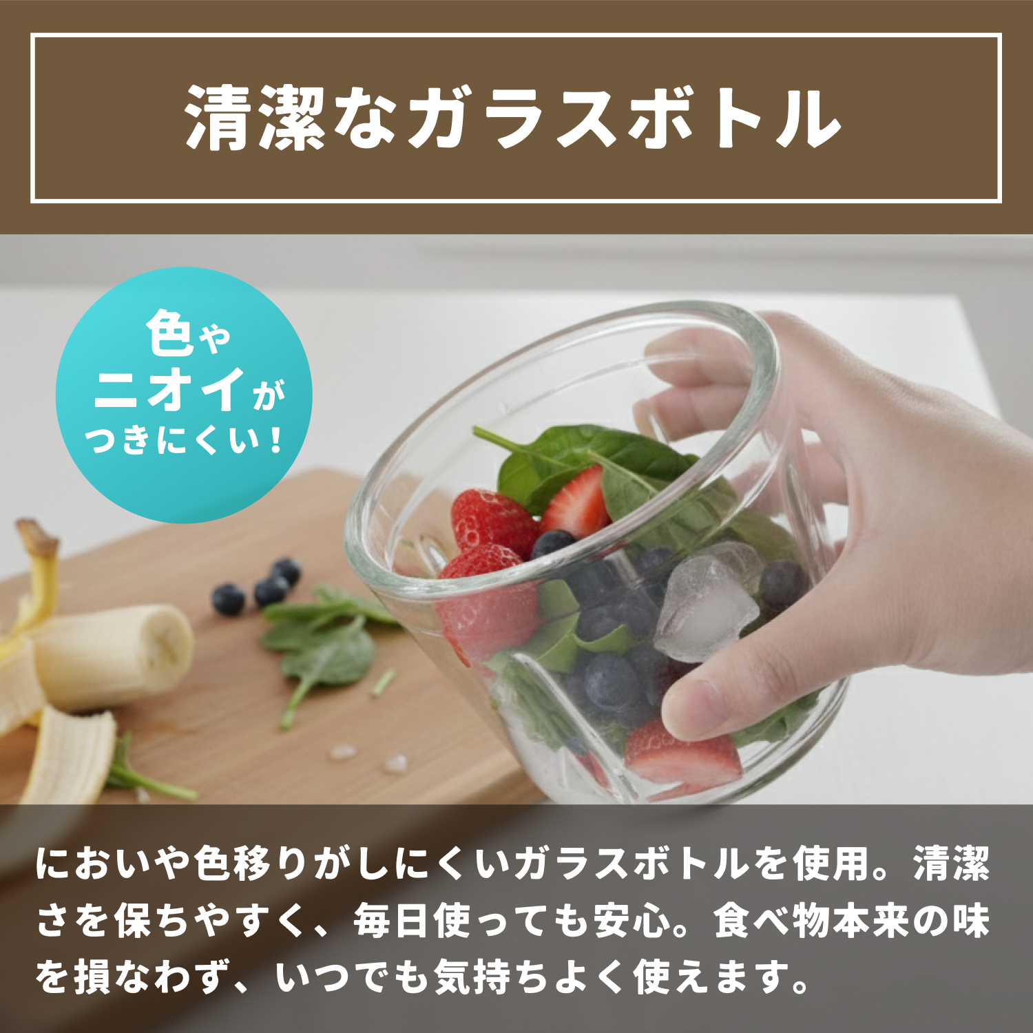 2.色やニオイがつきにくいガラス製ボトル
