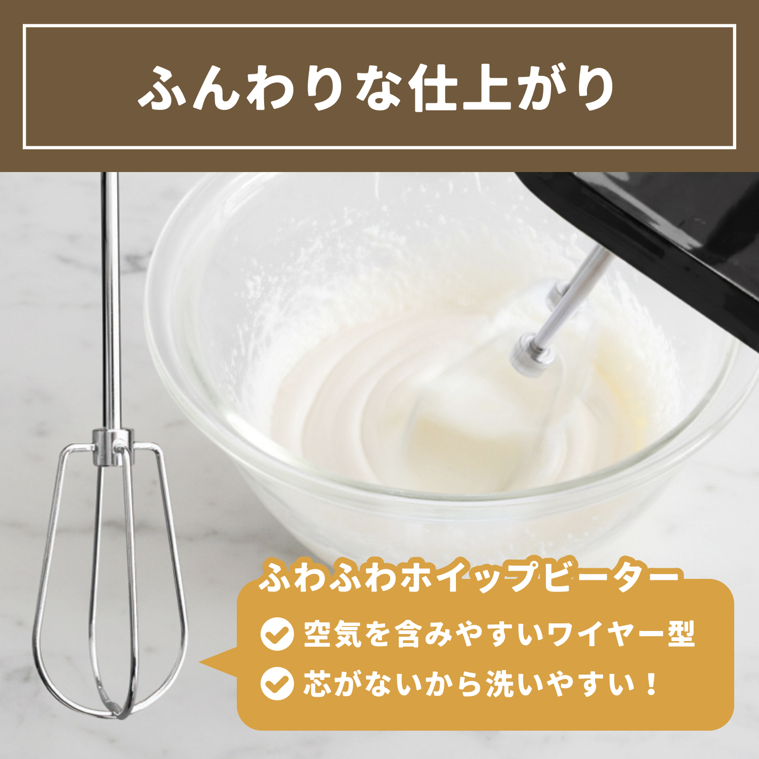 空気を含みやすいワイヤービーターでふわふわ仕上げ