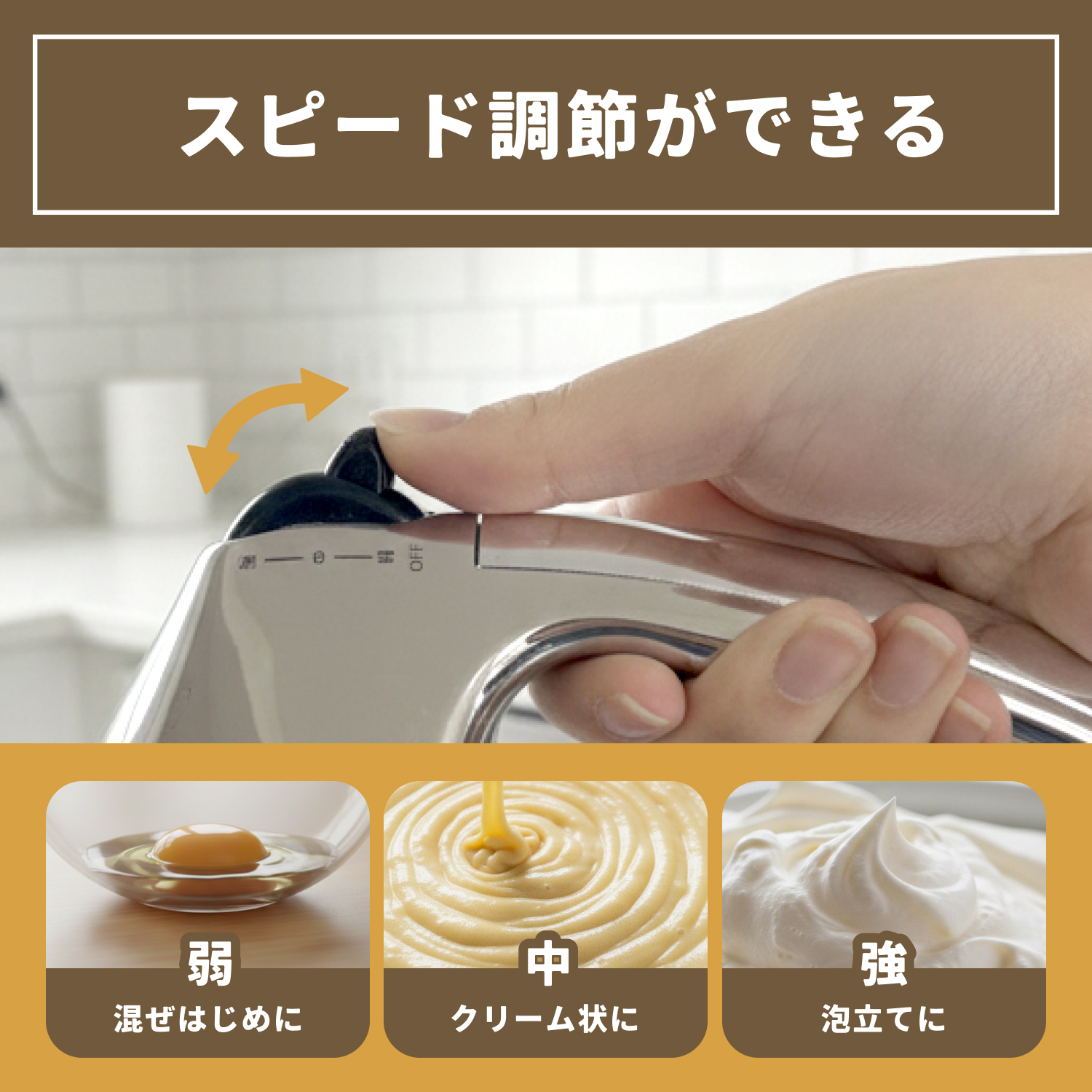 3.スピード調節可能で混ぜはじめから最後の仕上げまでこの一台で