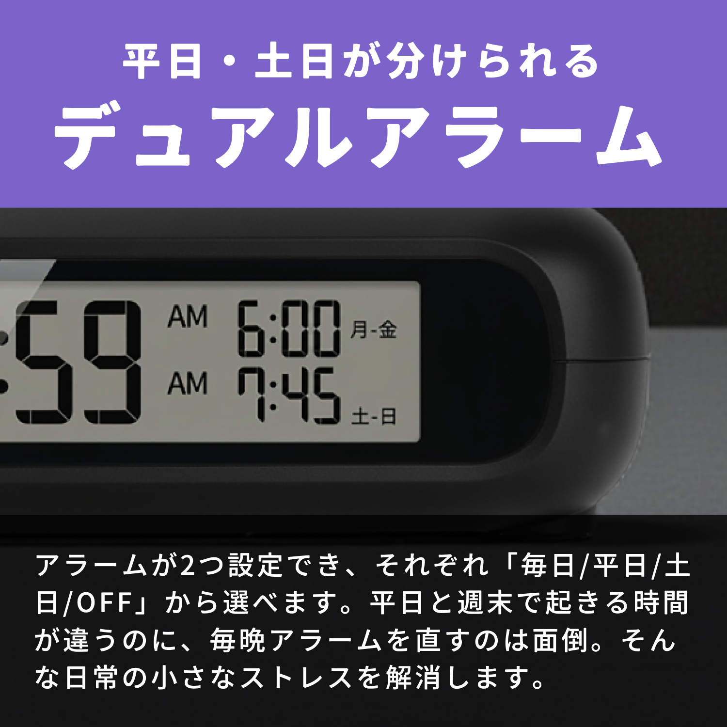 3.平日・土日で分けられるデュアルアラーム